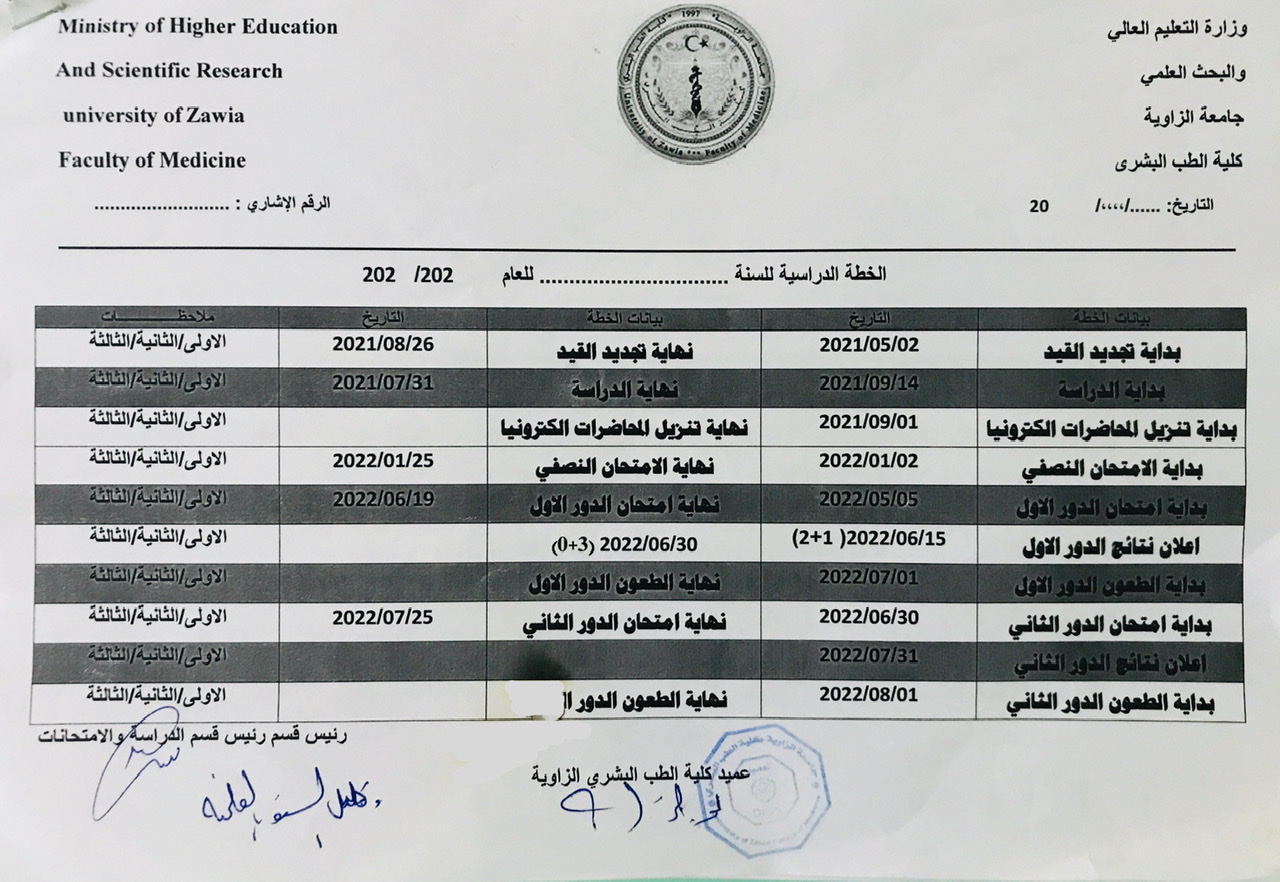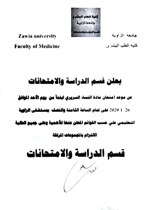 يعلن قسم الدراسة والامتحانات بكلية الطب البشري ان بداية العام الدراسي لسنة الخامسة الدفعة 15 هو 1-4-2019