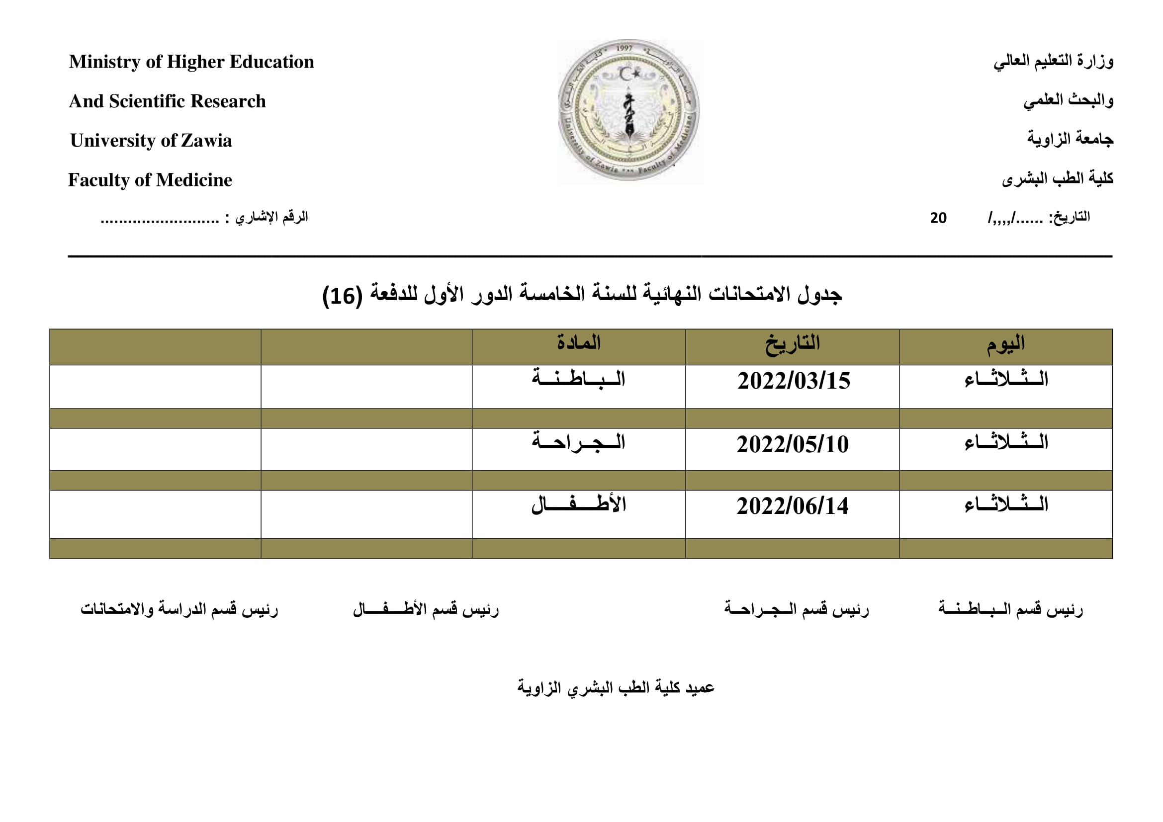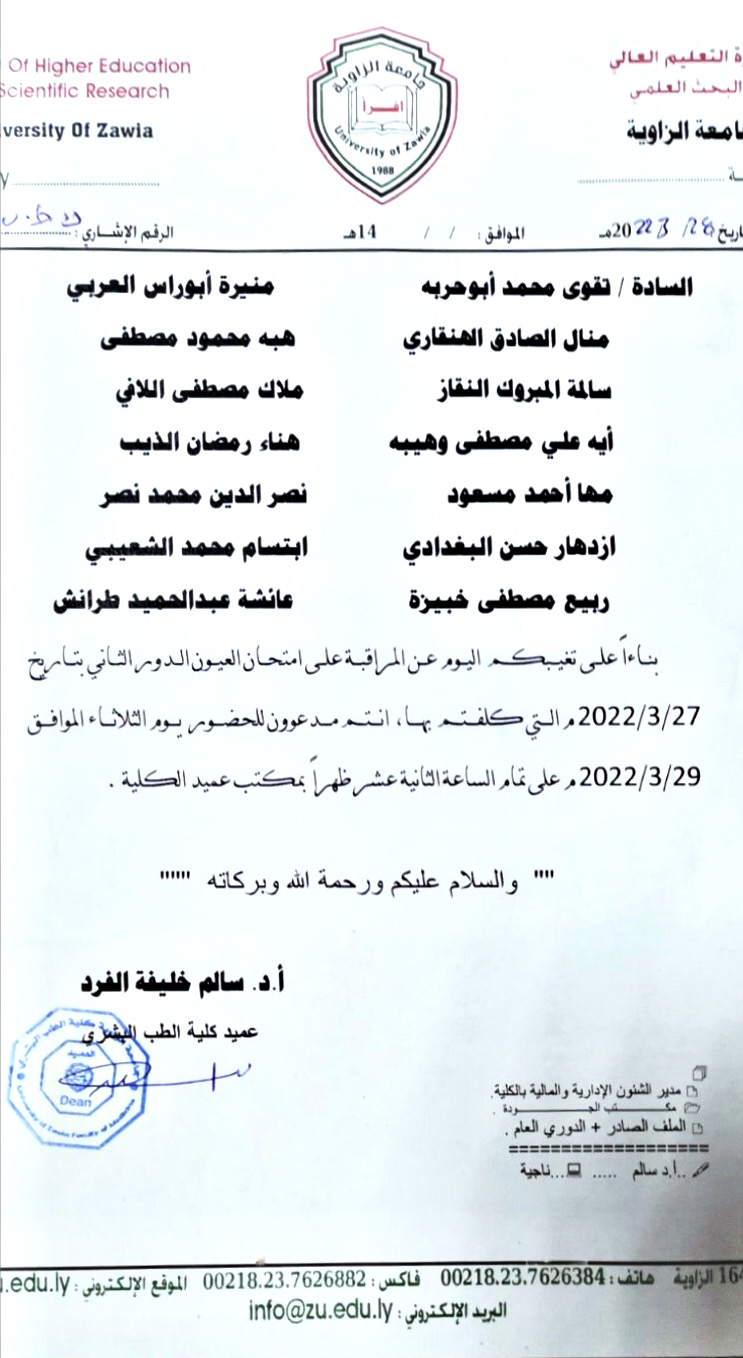 اسماء المكلفين بمراقبة امتحان الدور الأول لمادة الجراحة للسنة الخامسة الدفعة 16 وذلك يوم الثلاثاء الموافق 10-5-2022 الساعة الـ08:30 صباحاً.