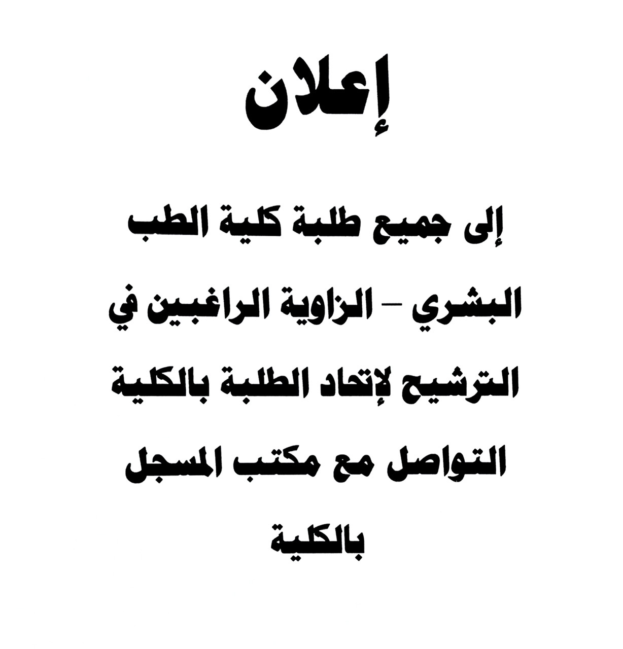 علي الطلبة المدرجين تحت المجموعتين C&D الإلتزام بحضور المحاضرات العامة ابتداء من يـوم 2-9 الي يوم 12-9 في ايّام الاسبوع ابتداء من الاثنينن إلى الخميس علي مدار أسبوعين علما بأن المحاضرات ستكون بمادة طب الاسرة والمجتمع فقط.