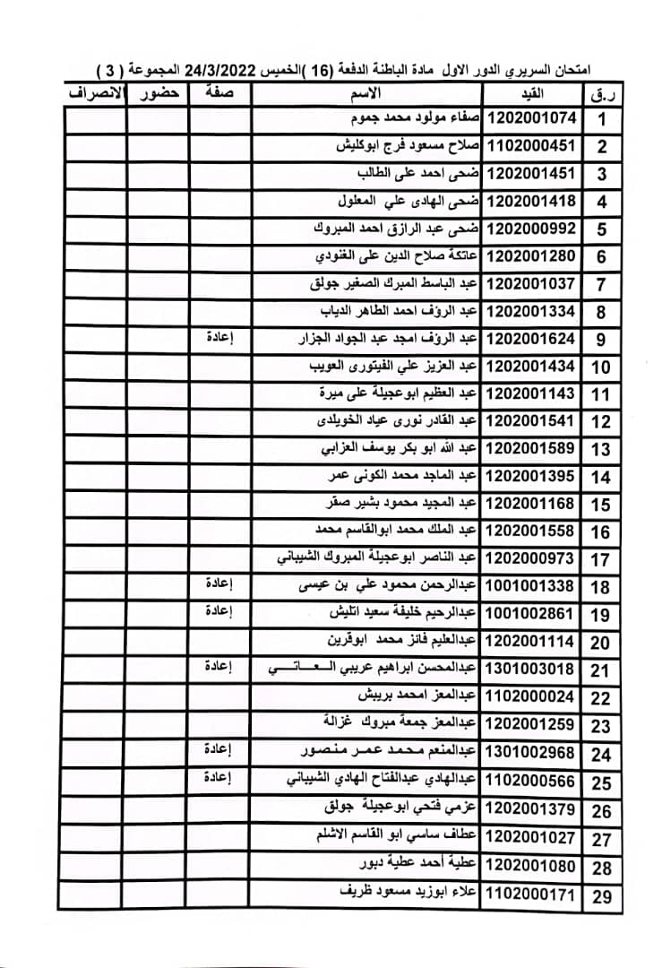 تقسيم المجموعات للامتحان السريري الدور الأول لمادة الباطنة للسنة الخامسة الدفعة 16 ابتداء من يوم الثلاثاء الموافق 22-3-2022 الى يوم الأربعاء الموافق 30-3-2022.