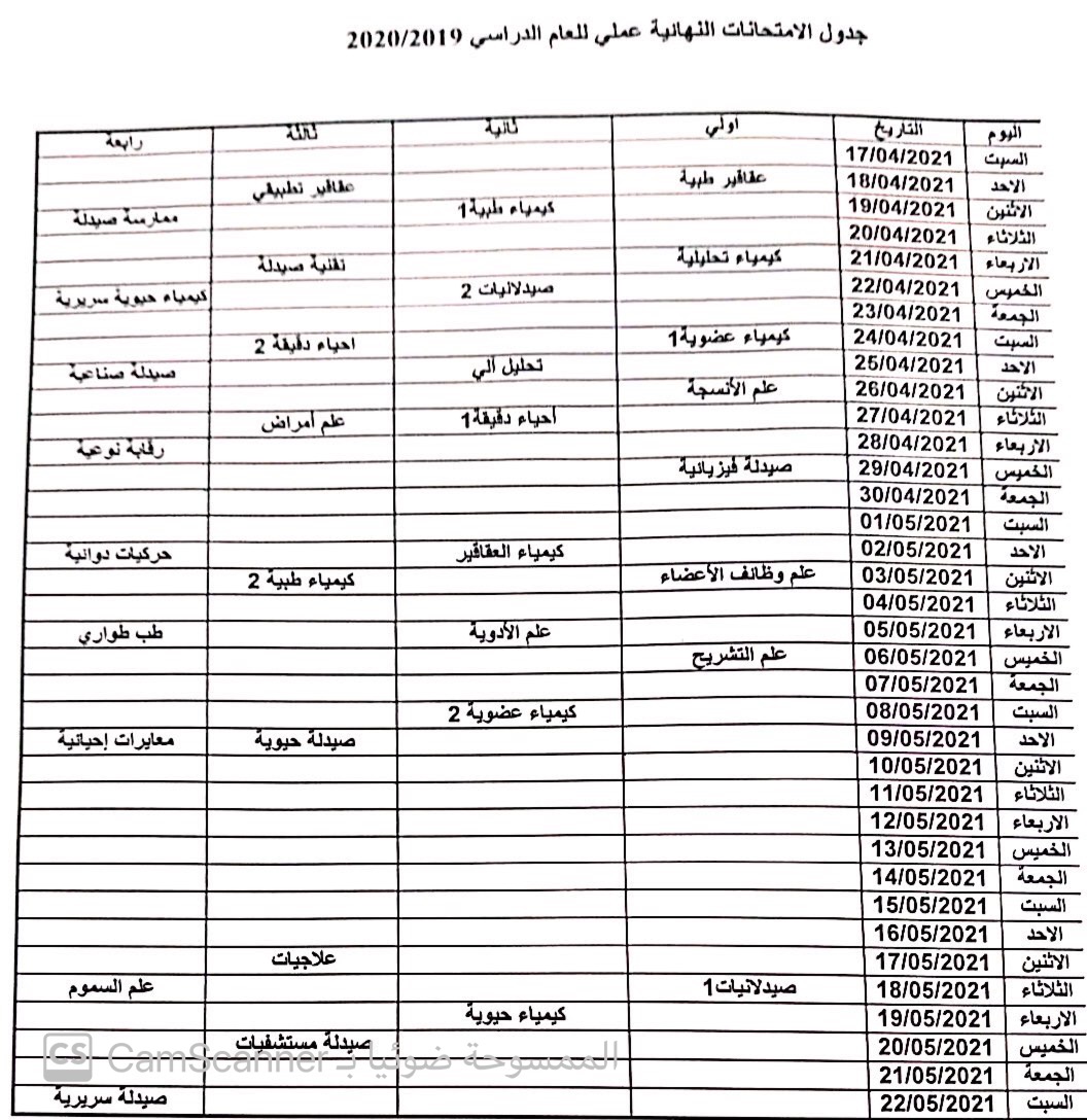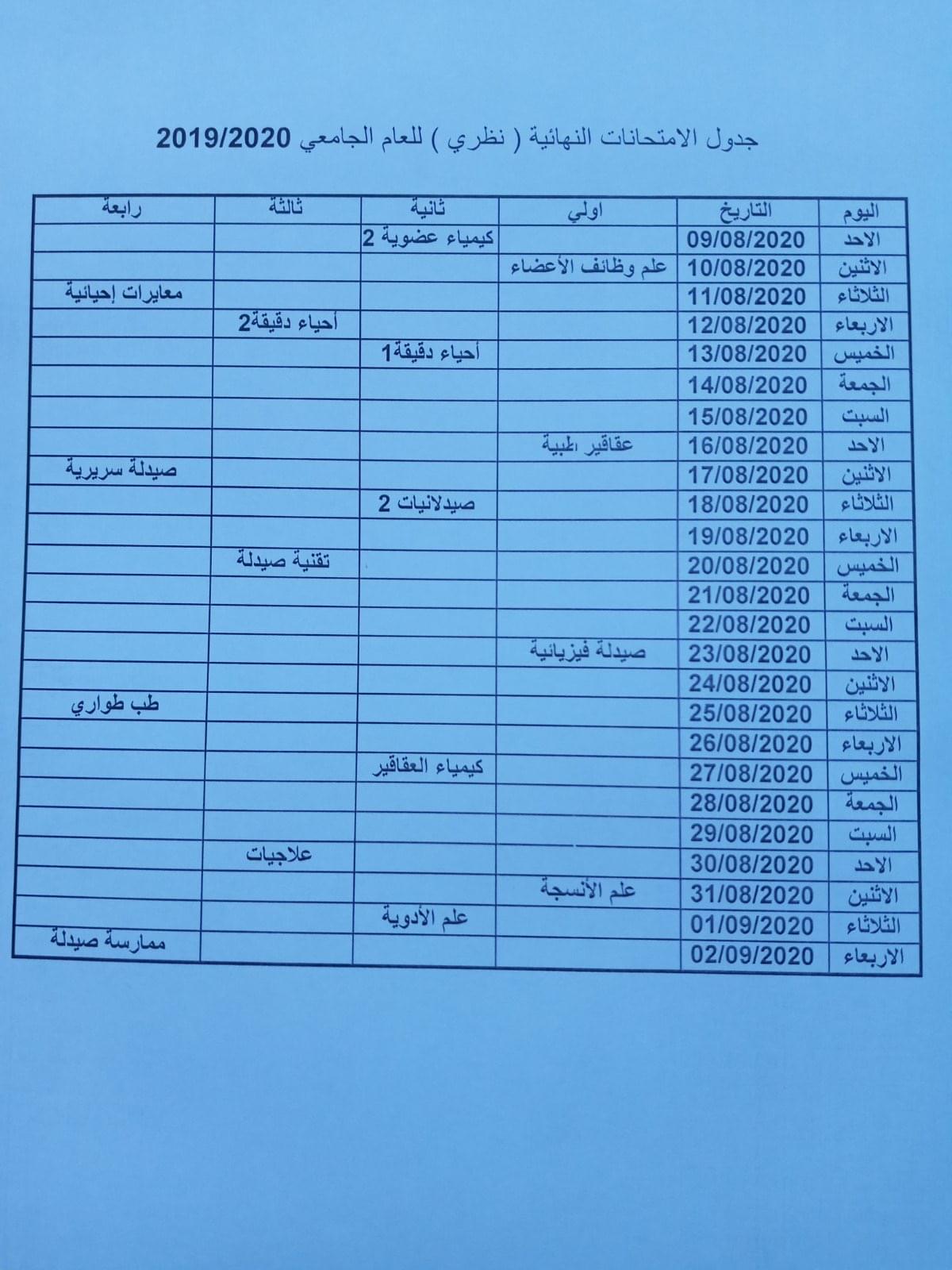 جدول الامتحانات النهائية (عملي ) للعام الجامعي 2020/2019