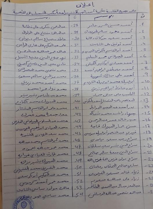 غلى جميع الطلبة الموجودين بالقائمة مراجعة مكتب المسجل لاستلام بطاقاتهم