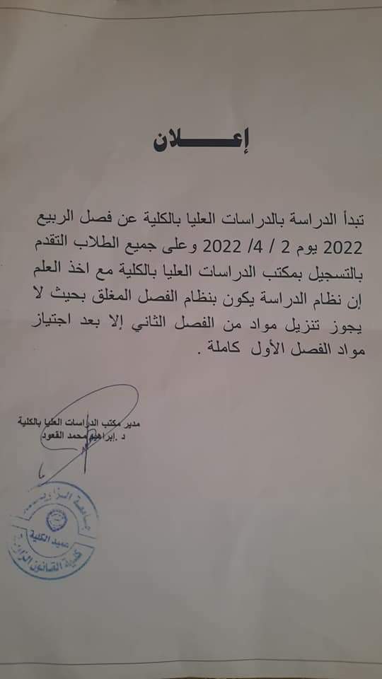 كما تطلب من معيدي قسم القانون العام ضرورة الحضور غدا للأهمية القصوى