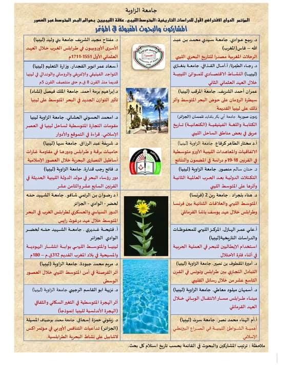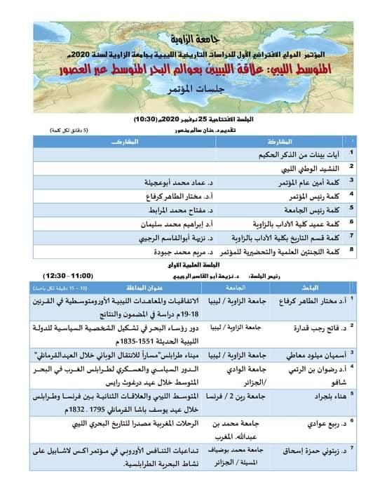 انطلاق الاستعدادات لانعقاد جلسات المؤتمر الدولي الافتراضي الأول للدراسات التاريخية الليبية بجامعة الزاوية 2020م المتوسط الليبي "علاقة الليبيين بعوالم البحر المتوسط عبر العصور"، والذي ينظمه قسم التاريخ بكلية الآداب بالزاوية برعاية وإشراف مركز البحوث والاستشارات العلمية بجامعة الزاوية، ويساهم في أعمال المؤتمر عبر جلسات علمية افتراضية عدد كبير من البحاث والمشاركين من الداخل والخارج وذلك يوم الأربعاء 25 نوفمبر 2020م، والدعوة عامة لكل المهتمين لمتابعة جلسات المؤتمر عبر تطبيق google meet))، وسوف ينشر رابط المشاركة للراغبين في المشاركين والتفاعل مع فعاليات المؤتمر الدولي الكبير .