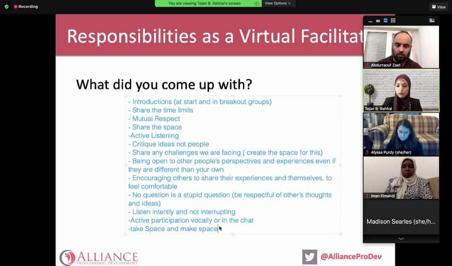ستتوالى هذه المحاضرات التدريبية على فترات محدده ومجدولة يتم تقسيم المشاركين فيها الى مجموعات (على ان يكون في كل مجموعة مشاركين من جامعة الزاوية واخرين من الشارقة ونيويورك وبنغازي), يشترك اعضاء كل مجموعة في اعداد العروض والمحاضرات والمناقشات) وسيكون فيه تقييم وجوائز في نهاية البرنامج .