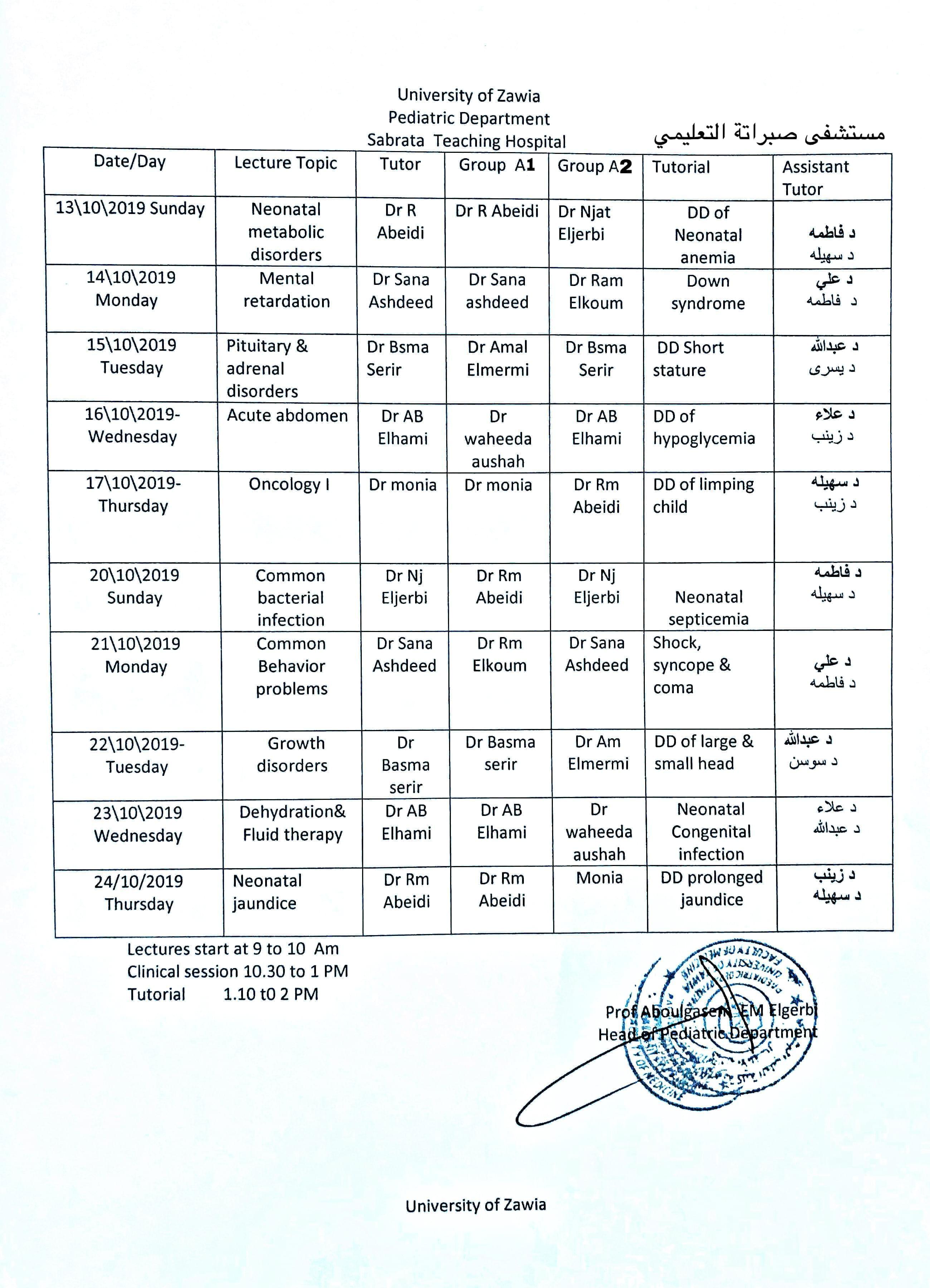 جدول المحاضرات مادة الأطفال لسنة خامسة طب بشري