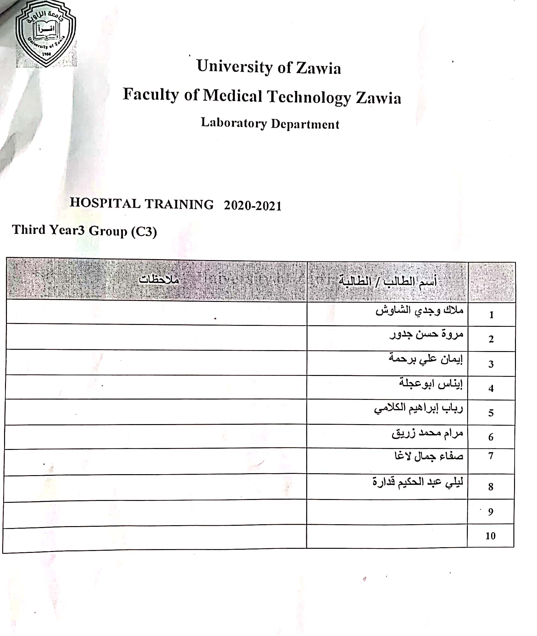 نلفت عنايتكم إلى ضرورة التواجد بمستشفى الزاوية التعليمي أمام المختبر بمبنى المستشفى وذلك يوم غدٍ الأحد الموافق 2022/01/09م. على تمام الساعة التاسعة والنصف 09:30 صباحاً .