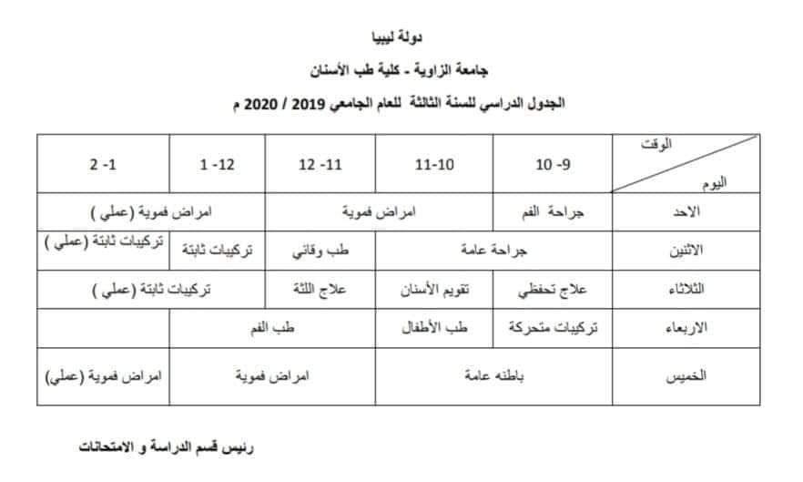 الجدول الدراسي الخاص بطلبة السنة الثالثة أسنان