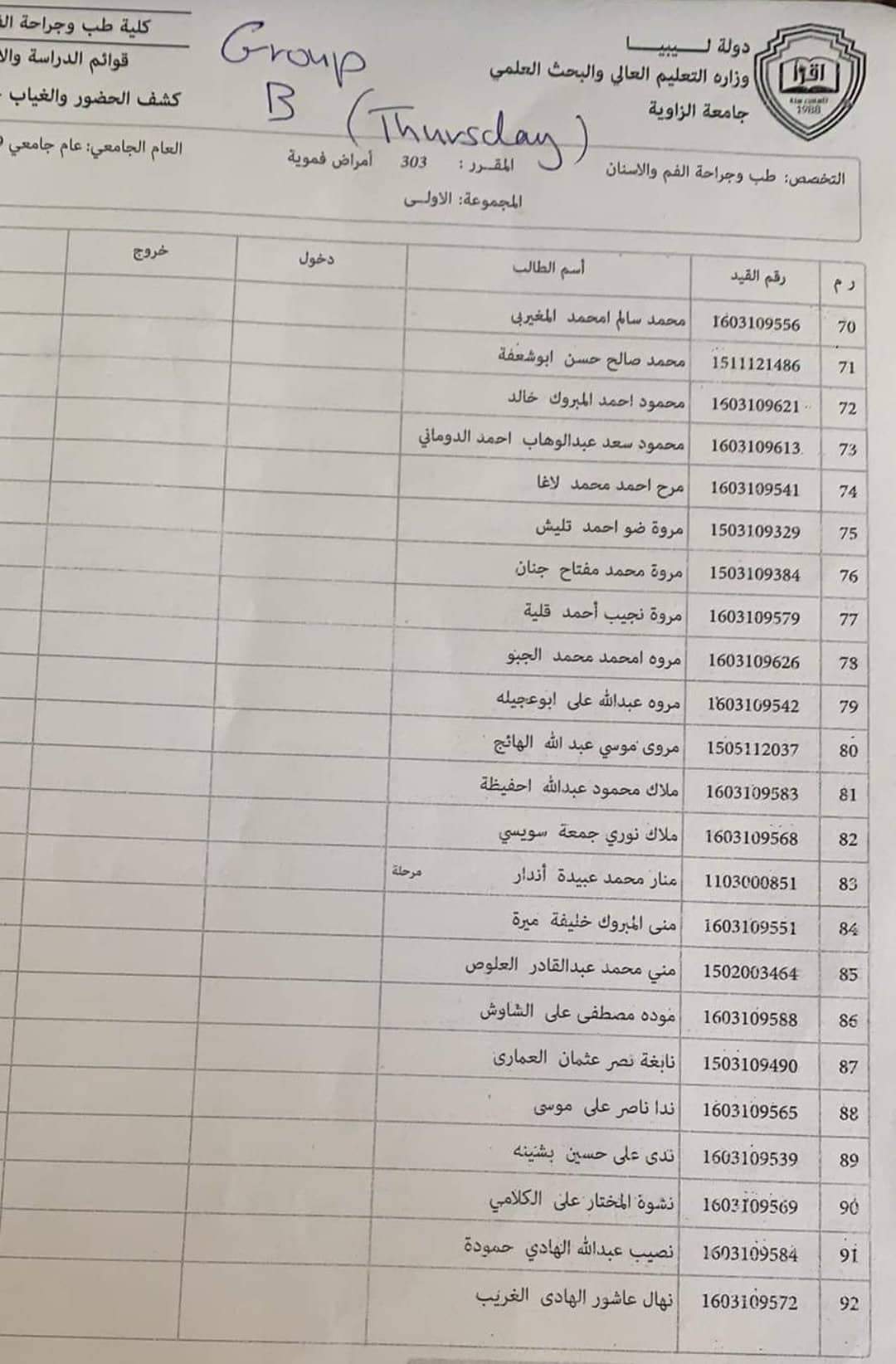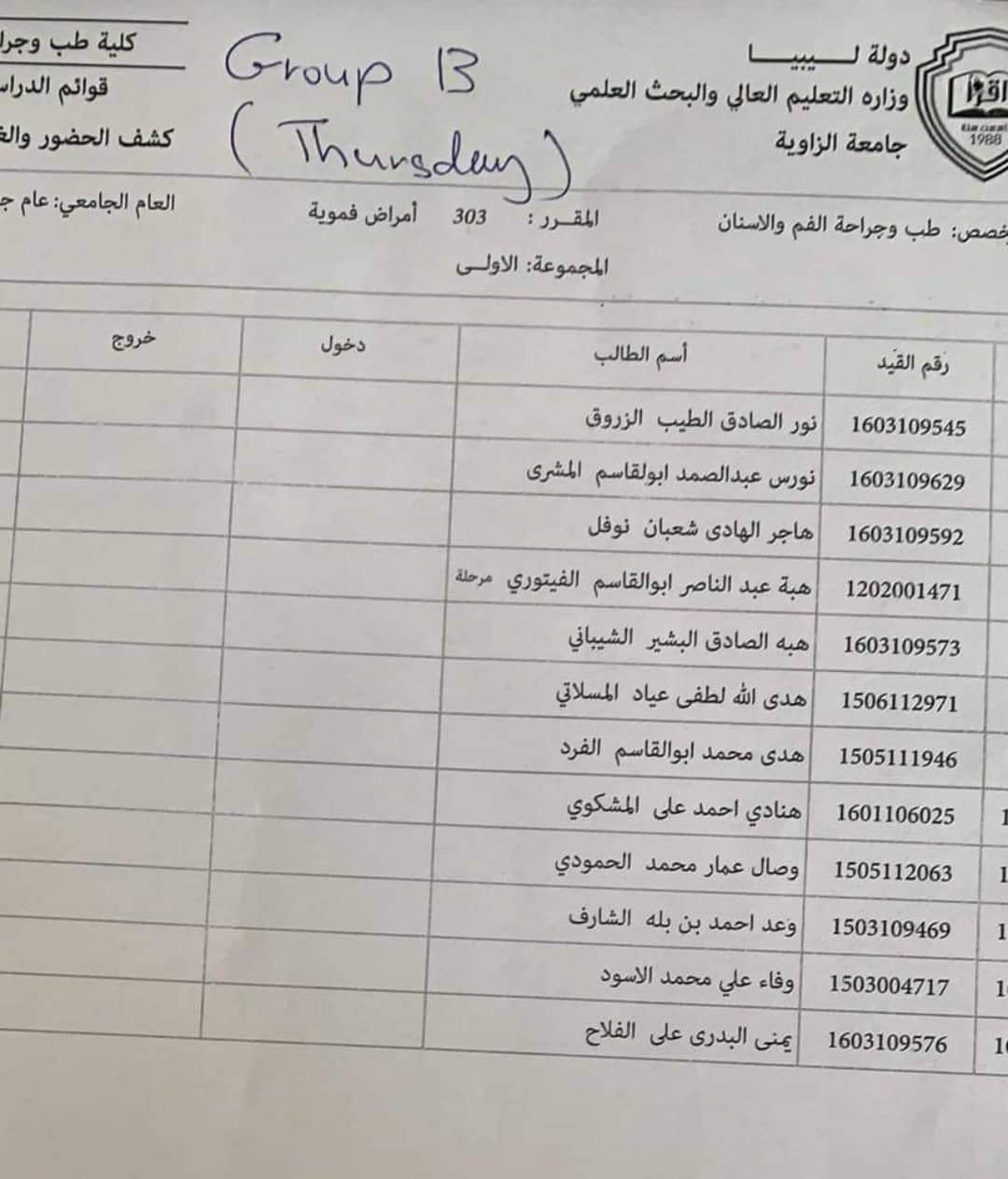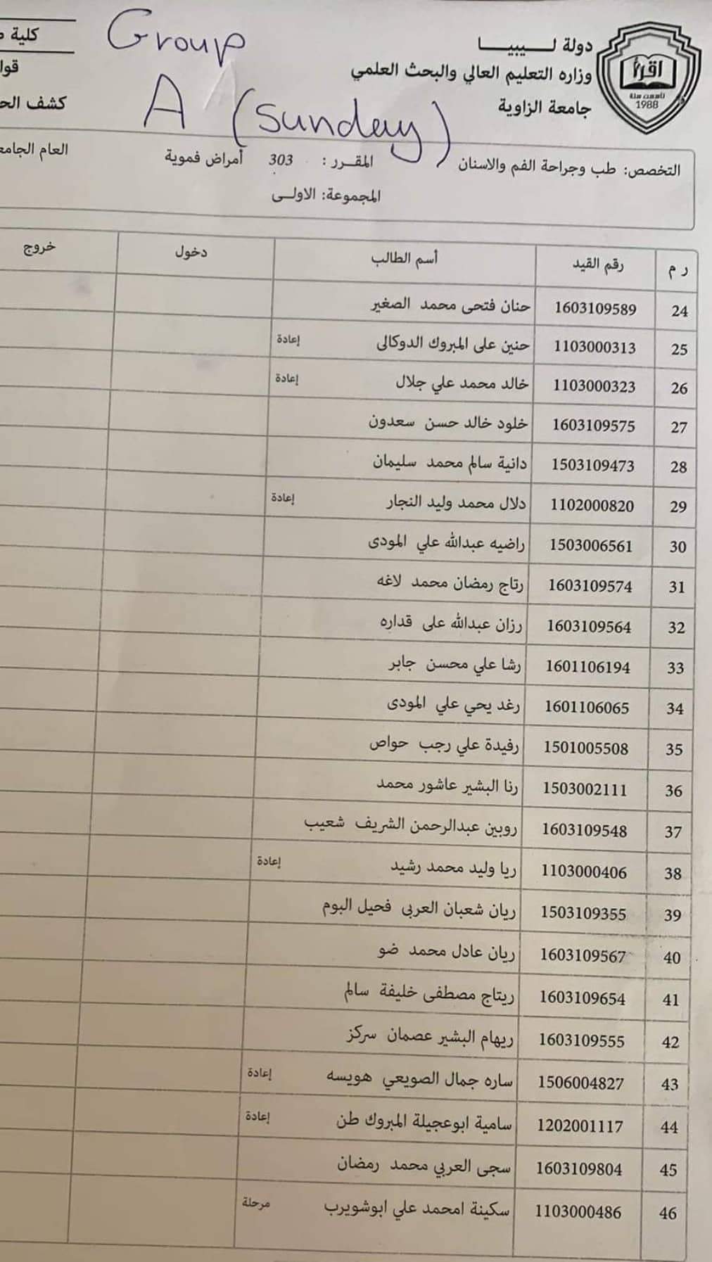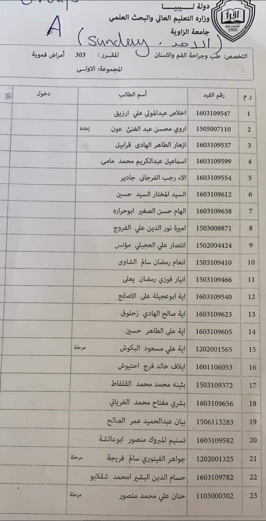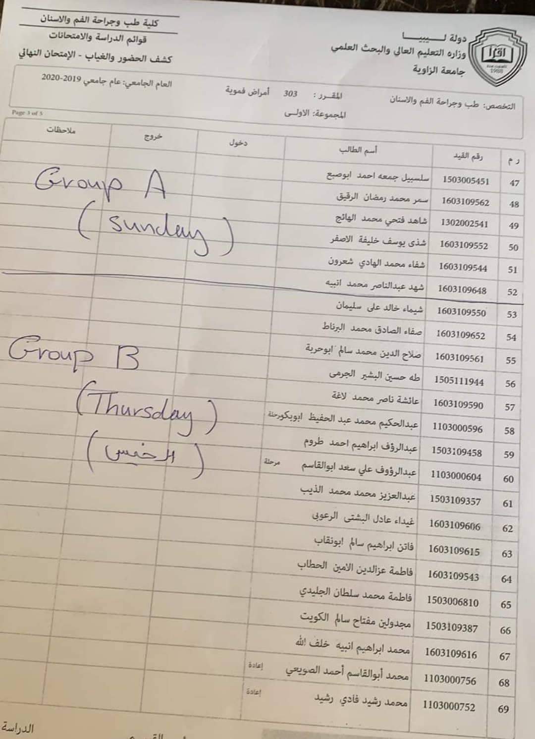 قوائم العملي لطلبة السنه_الثالثه لمادة الأمراض الفمويه ليومي الأحد والخميس