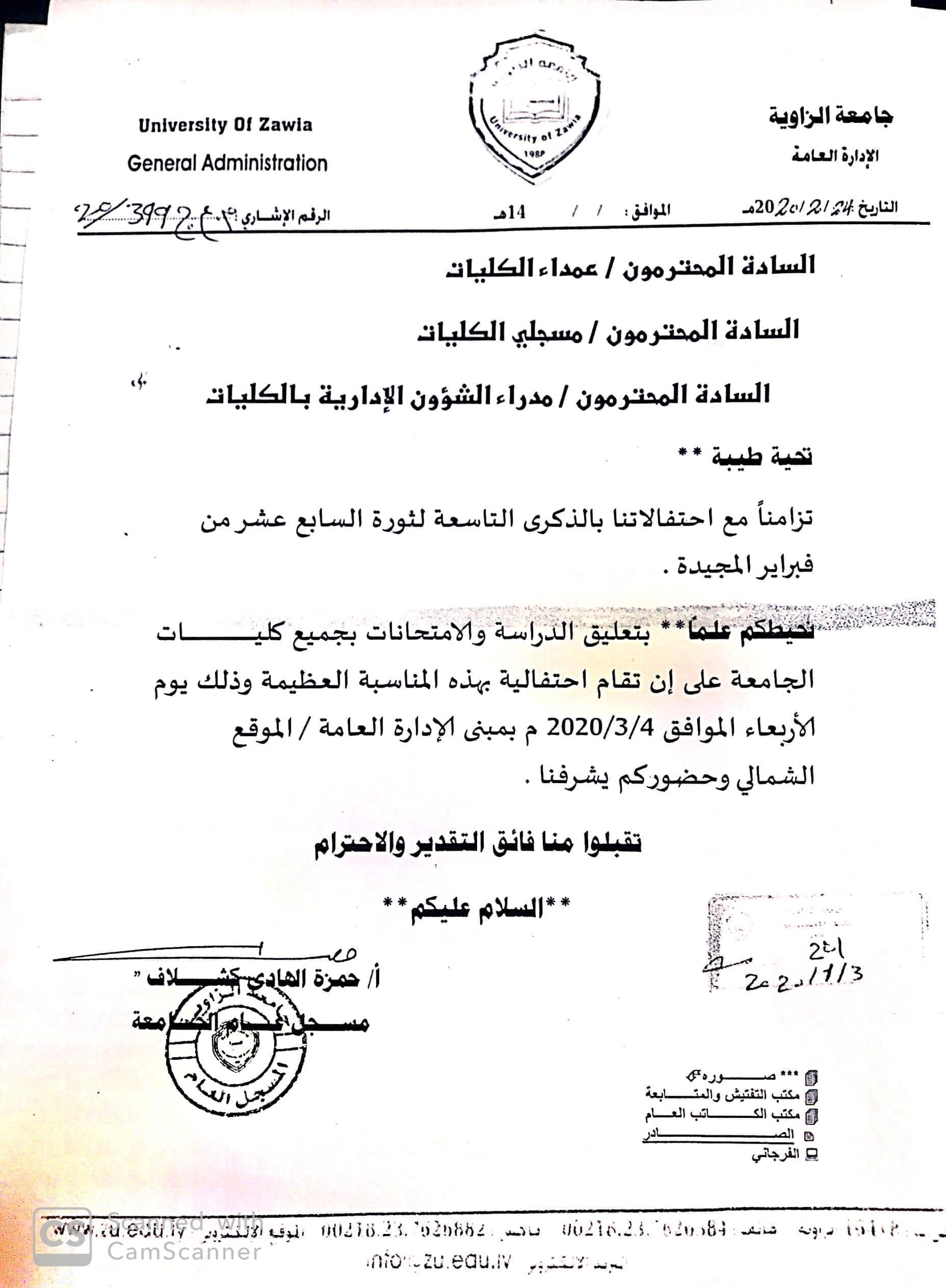 تعلمكم إدارة كلية طب وجراحةالفم والأسنان انه قد تم تعليق الدراسة والامتحانات ليوم الغد الاربعاء 4/3/2020 بناء علي رسالة المسجل العام المرفقة في الاعلان