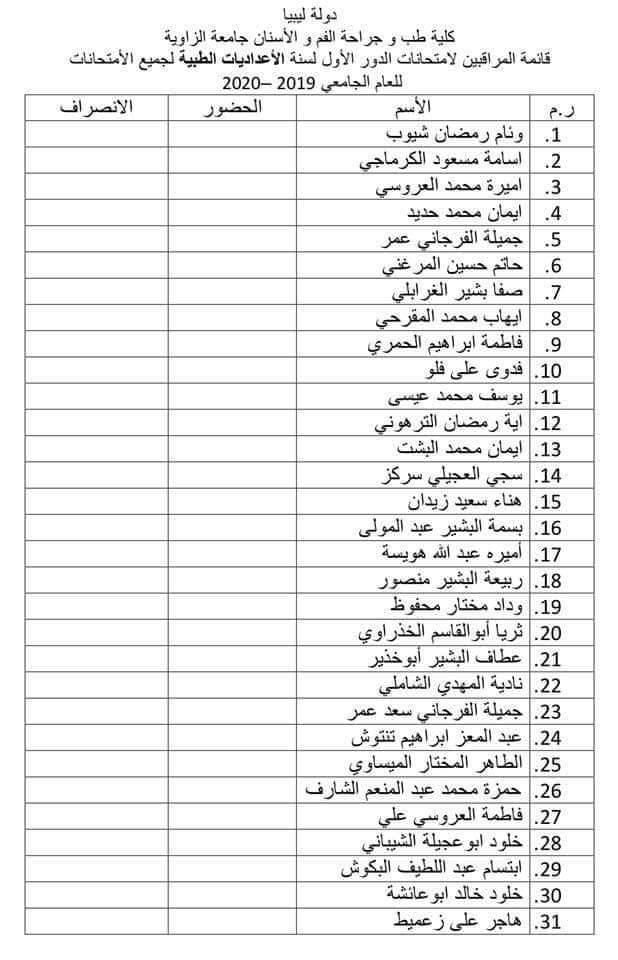 قائمة المعيدين المراقبين على امتحان الاعداديات الطبيه الدور الأول ليوم الثلاثاء القادم الموافق 6 / 10 / 2020 لمادة الكيمياء العامة على تمام الساعه11:00 يرجى الإلتزام بالحضور