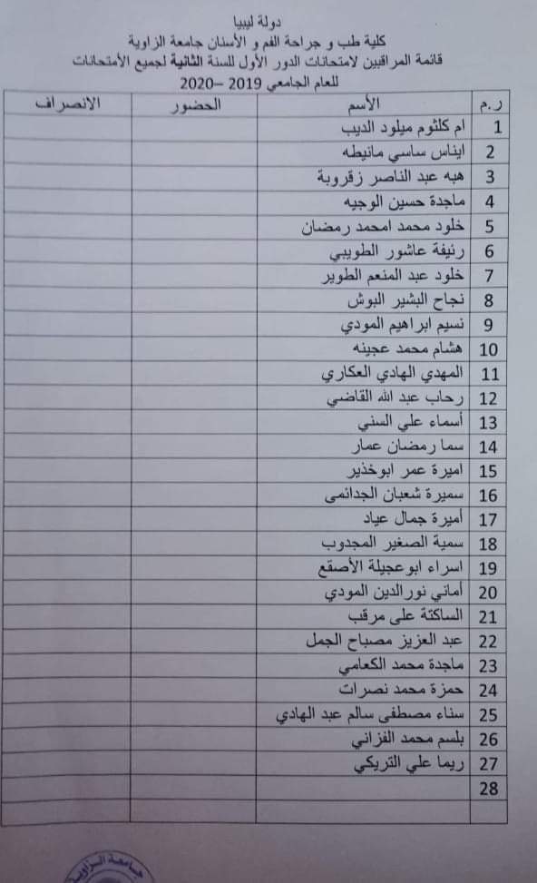 قائمة المعيدين المراقبين على امتحان السنة الثانيه الدور الأول ليوم غذا الاثنين لمادة الأنسجة الفمويه على تمام الساعه 9 يرجى الإلتزام بالحضور والإجراءات الوقائية