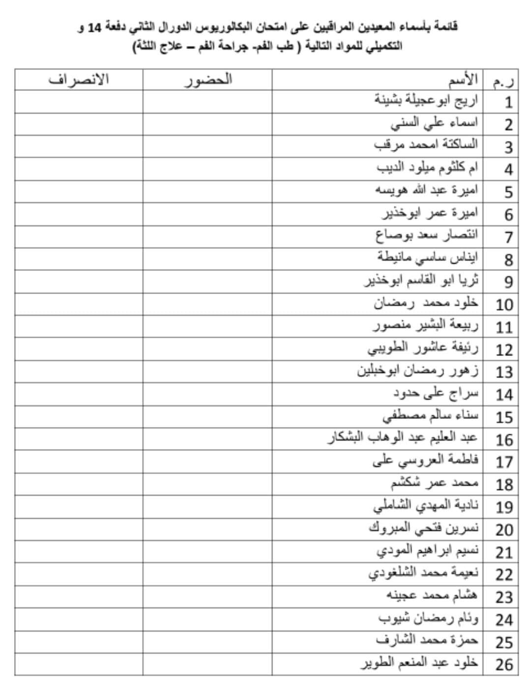 قائمة المعيدين المراقبين على امتحان الدور الثاني للسنه الرابعه الدفعه 14 والتكميلي ليوم الأحد الموافق 22 / 11 /2020 لمادة طب الفم على تمام الساعه 9 يرجى الإلتزام بالحضور والإجراءات الوقائية