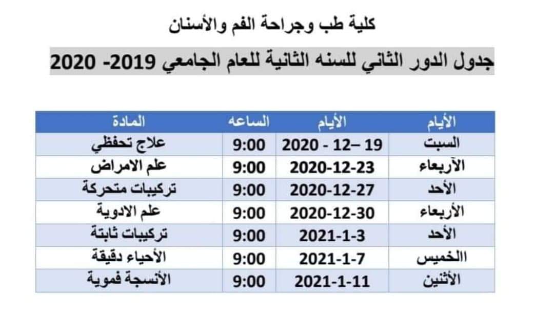 جدول السنه الثانيه الدور الثاني للعام الجامعي 2019 - 2020