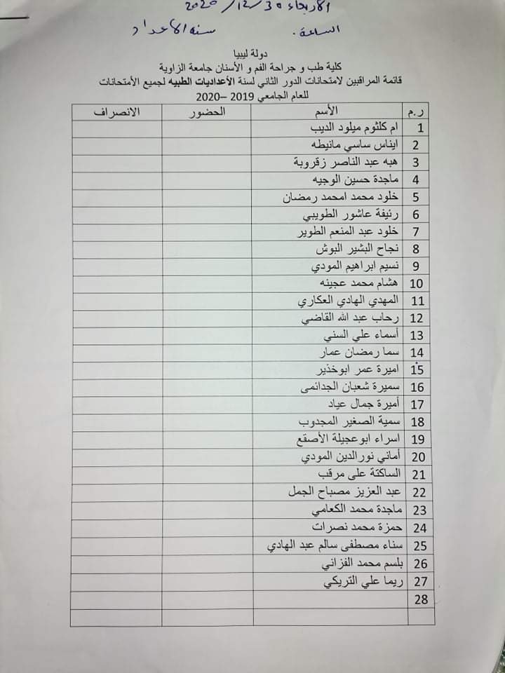 قائمة المعيدين المراقبين على امتحان ليوم غذا الأحد الموافق 3/ 1/2021 الدور الثاني للسنه الثانيه والاعداديات الطبية على تمام الساعه 9