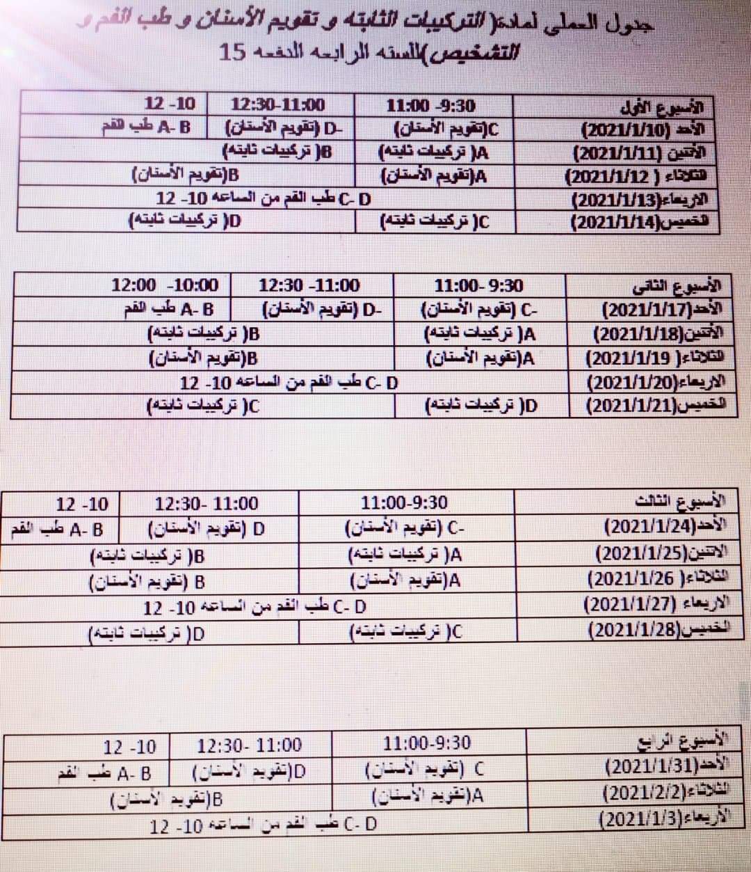 إعلان لطلبة السنه الرابعة الدفعة 15 اخد العلم بأن العملي رح يكون حسب الجدول المرفق بالإعلان وننوه بأن مكان العملي في قاعات المحاضرات وللأهمية يرجي الحضور ومراعاة أساليب طرق الوقاية