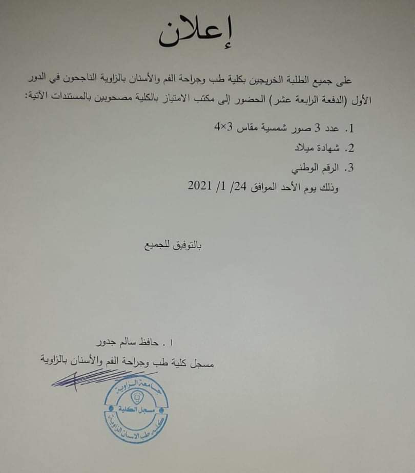 إعلان لطلبة السنة الرابعة الدفعه 14 والتكميلي الناجحون من الدور الأول