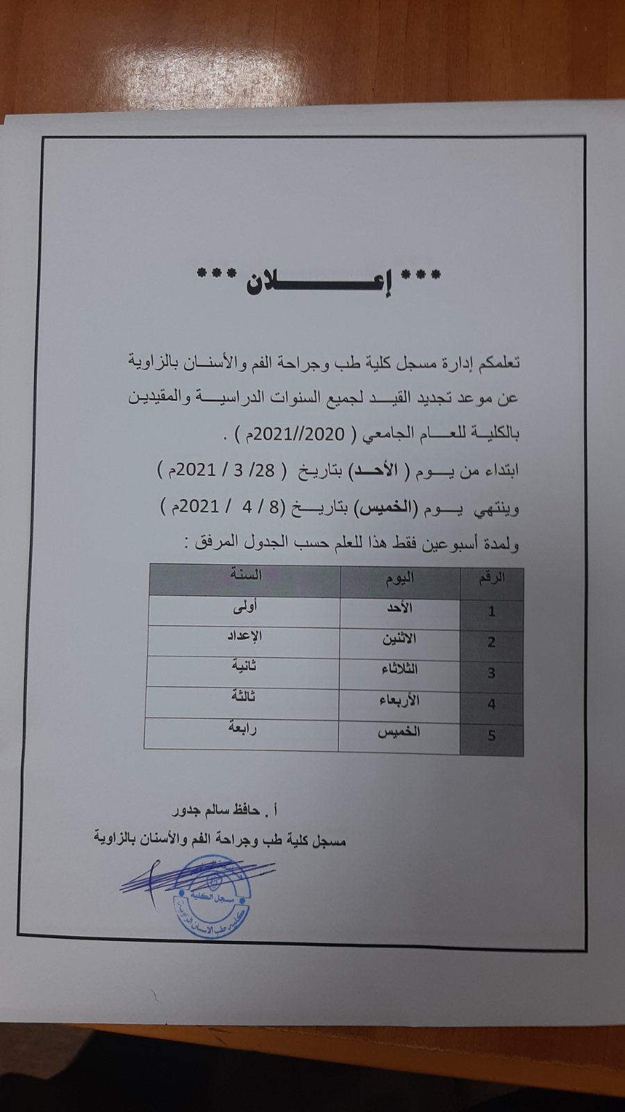 تعلمكم إدارة مسجل كلية طب وجراحة الفم والأسنان بالزاوية عن موعد تجديد القيد لجميع السنوات الدراسية والمقيدين بالكلية للعام الجامعي 2020_2021.