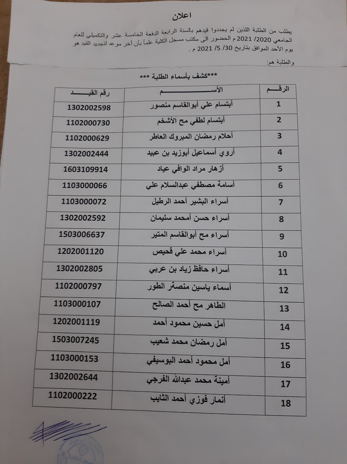 يطلب من الطلبة اللذين لم يجددوا قيدهم بالسنة الرابعة الدفعة الخامسة عشر والتكميلي للعام الجامعي 2020_2021 الحضور الي مكتب مسجل الكلية علما بأن أخر موعد لتجديد القيد هو يوم الأحد الموافق 30_5_2021