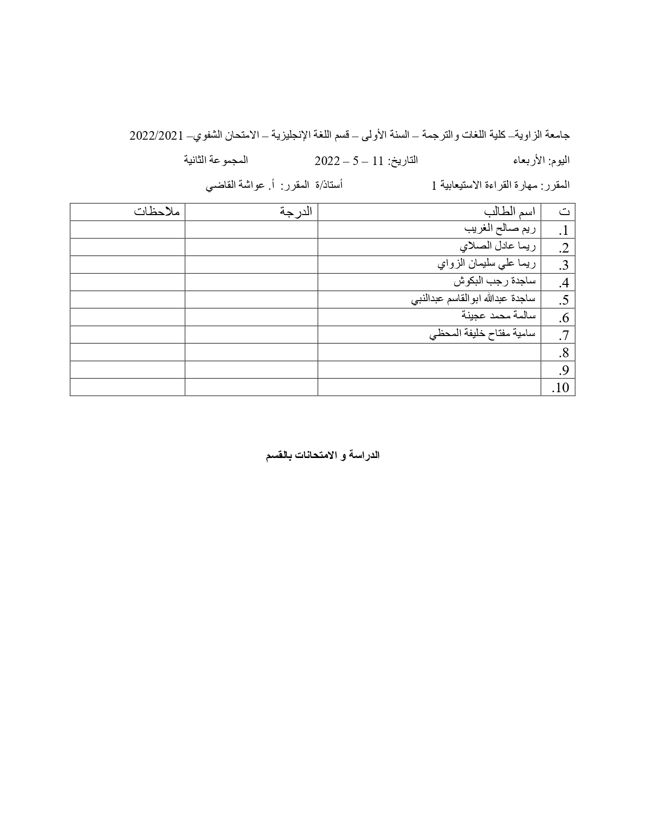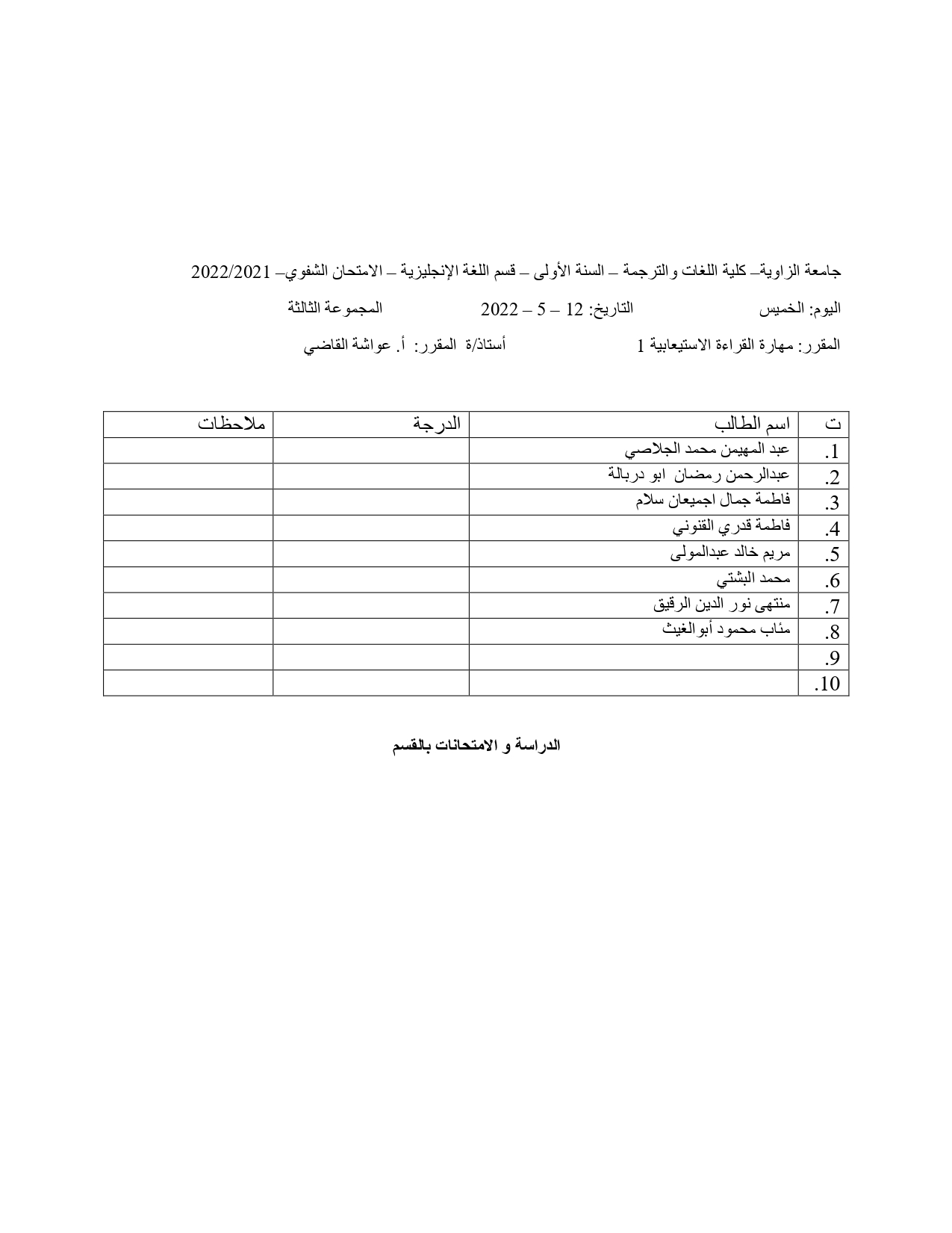 1. على جميع طلبة السنة المقيدين بقسم اللغة الإنجليزية و الذين لم ترد أسماؤهم في قوائم الأسماء التي أُعْلِنَ عنها مسبقاً، ضرورة مراجعة إدارة القسم يوم السبت القادم الموافق 7-5-2022م. 2. على جميع طلبة التكميلي للسنوات (الأولى و الثانية ) الذين وردت أسماؤهم في مقررات تمت تصفيتها غير ملزمين بأداء الامتحانات بها. #مكتب الدراسة و الامتحانات بالكلية