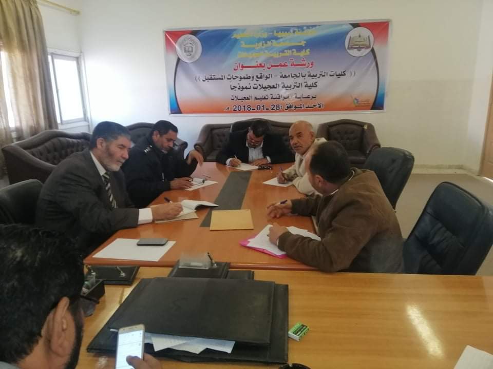 وبعض اعضاء هيئة التدريس بالكلية قارين ومتعاونين كذلك كان من ضمن الحضور السيد العقيد محمد المزوغي مدير الأمن بمنطقة العجيلات والشيخ الافي حاضر بأسم لجنة المصالحة بمنطقة العجيلات والسيد أ.وليد ويبة الاعلامي والناطق بأسم لجنة المصالحة بالمنطقة وكذلك منذوب على هيئة الأوقاف بالمنطقة....وكانت بداية الاجتماع بكلمة ترحيب من الدكتور عصام احمد الكوني عميد الكلية وعرض عنوان ورشة العمل (المصالحة الوطنية ودورها في الاستقرار الأمني بمدينة العجيلات) وبدأت المناقشة في موضوع الورشة ووزعت الكلمات ع كل الحاضرين وتم الاتفاق وسمع وجهات النظر للجميع وحدد يوم السبت القادم موعد تاني للاجتماع لتحديد اللجان والمهام والله ولي التوفيق