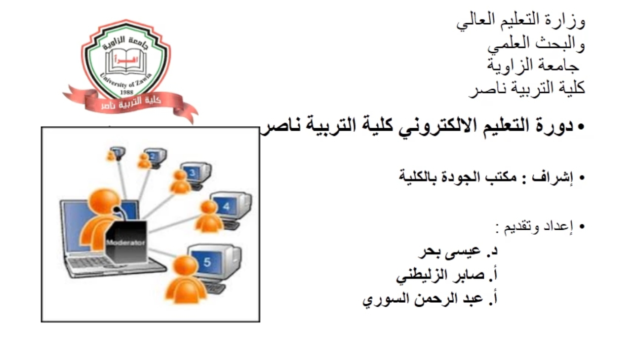 اختتمت كلية التربية ناصر بجامعة الزاوية يوم الاربعاء الموافق 30 ديسمبر2020 الدورة التدريبية التي انطلقت يوم الاحد الموافق29 نوفمبر 2020 بقاعة المؤتمرات بالكلية، تحت عنوان: (التعليم الالكتروني وآفاق المستقبل) بهدف الرفع من كفاءة اعضاء هيئة التدريس بالكلية في كيفية التعامل مع المتطلبات الاساسية للتعليم الالكتروني، واشتملت الدورة على اربعة حقائب تدريبية جائت على النحو التالي: