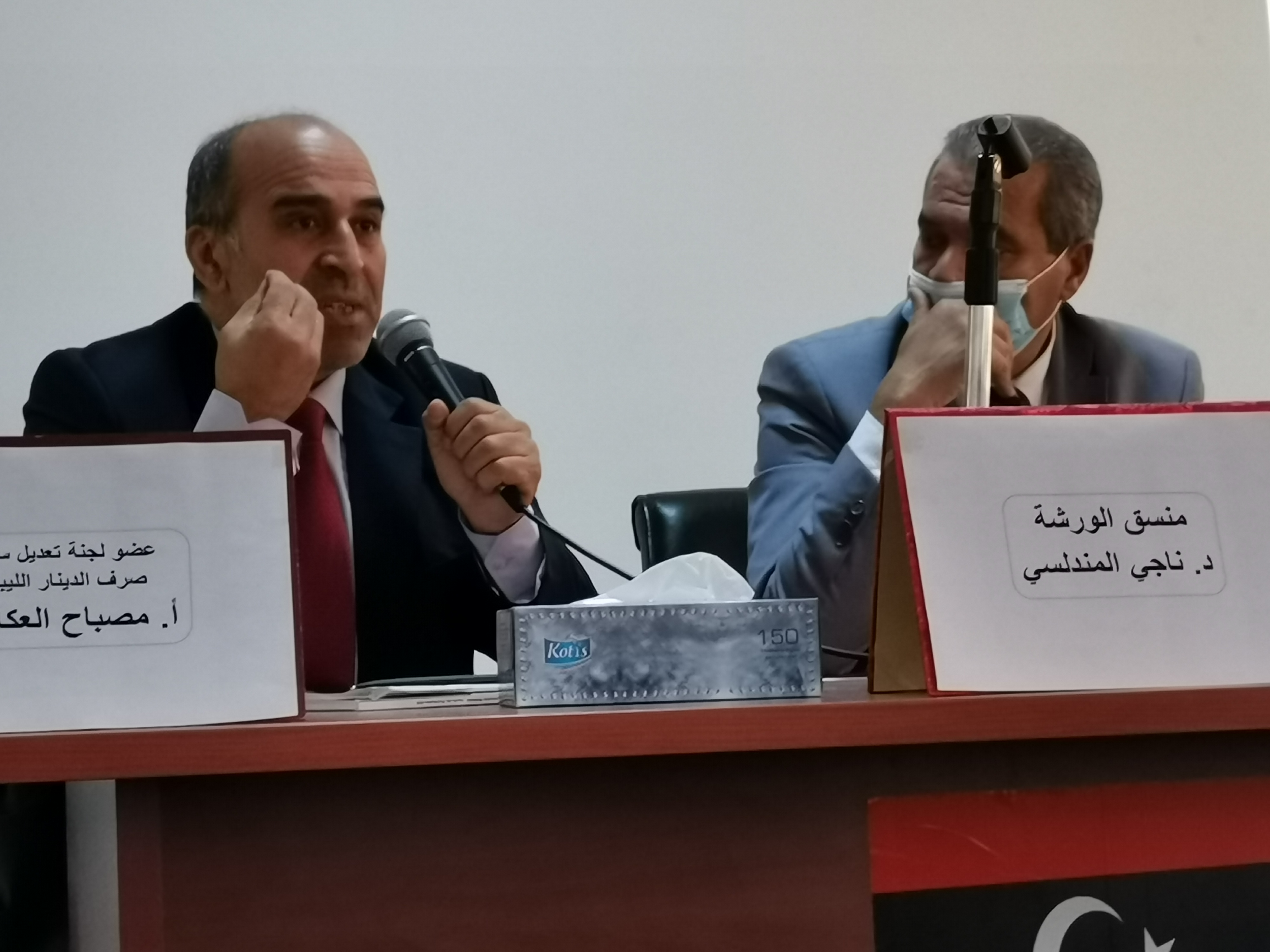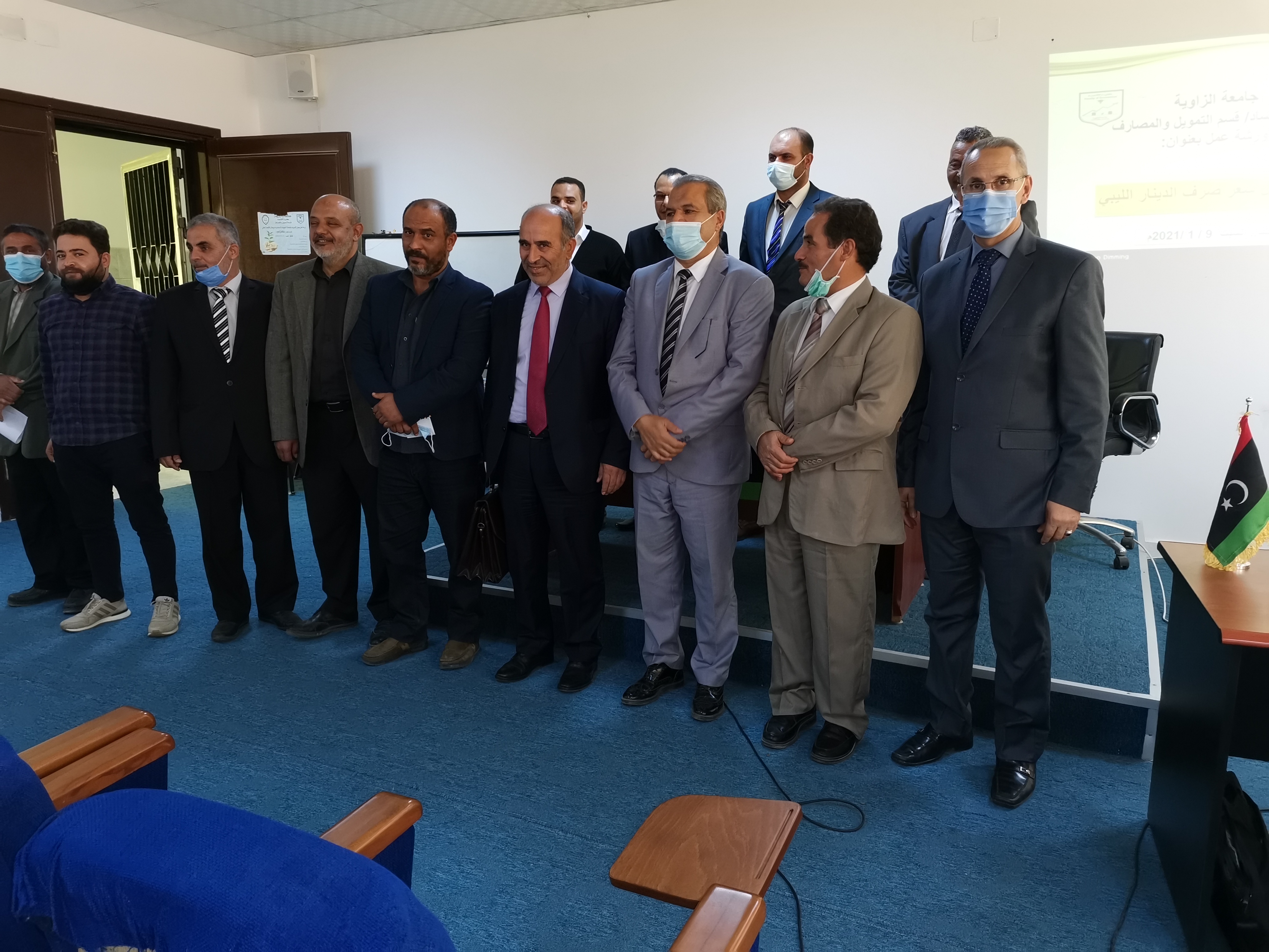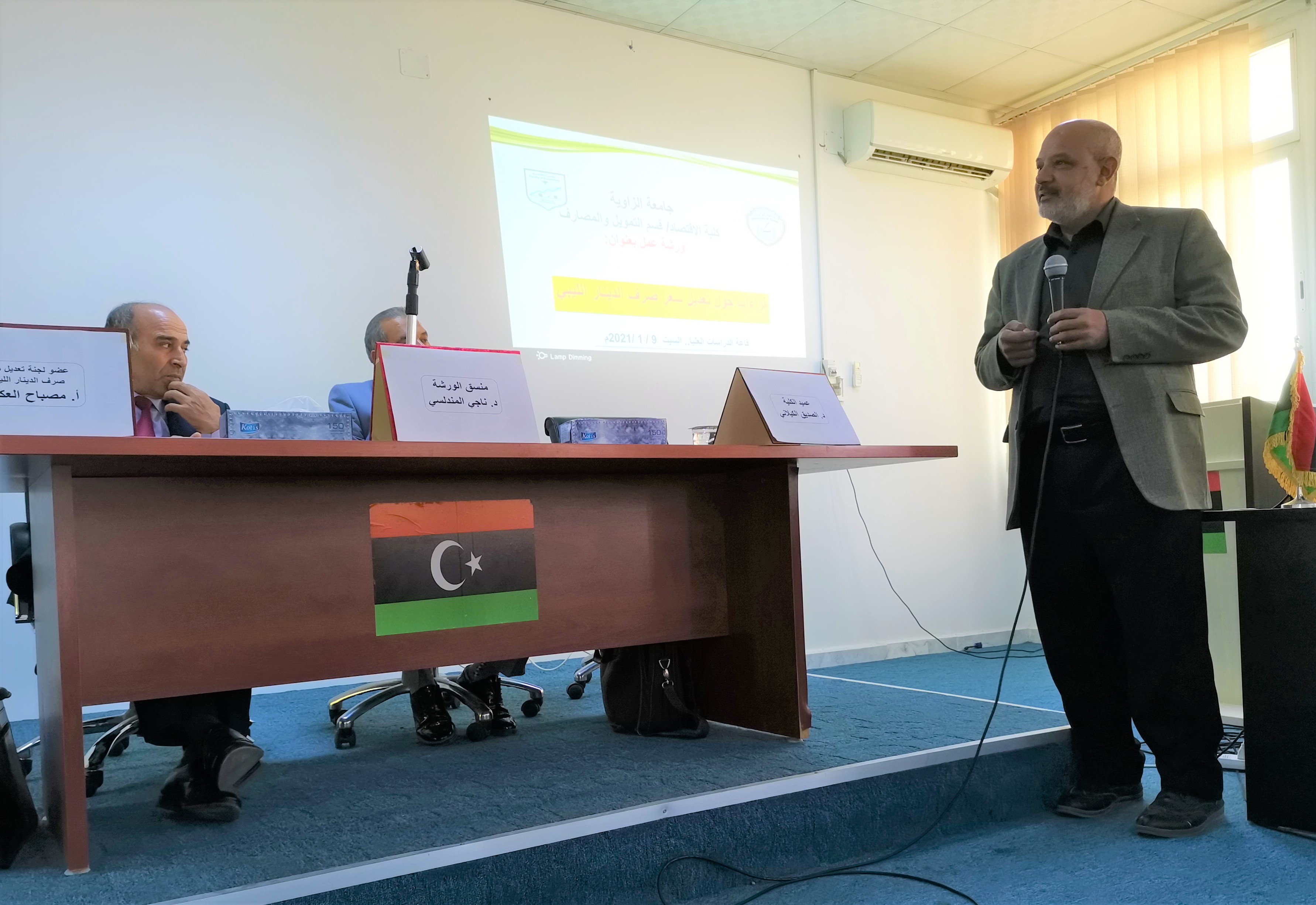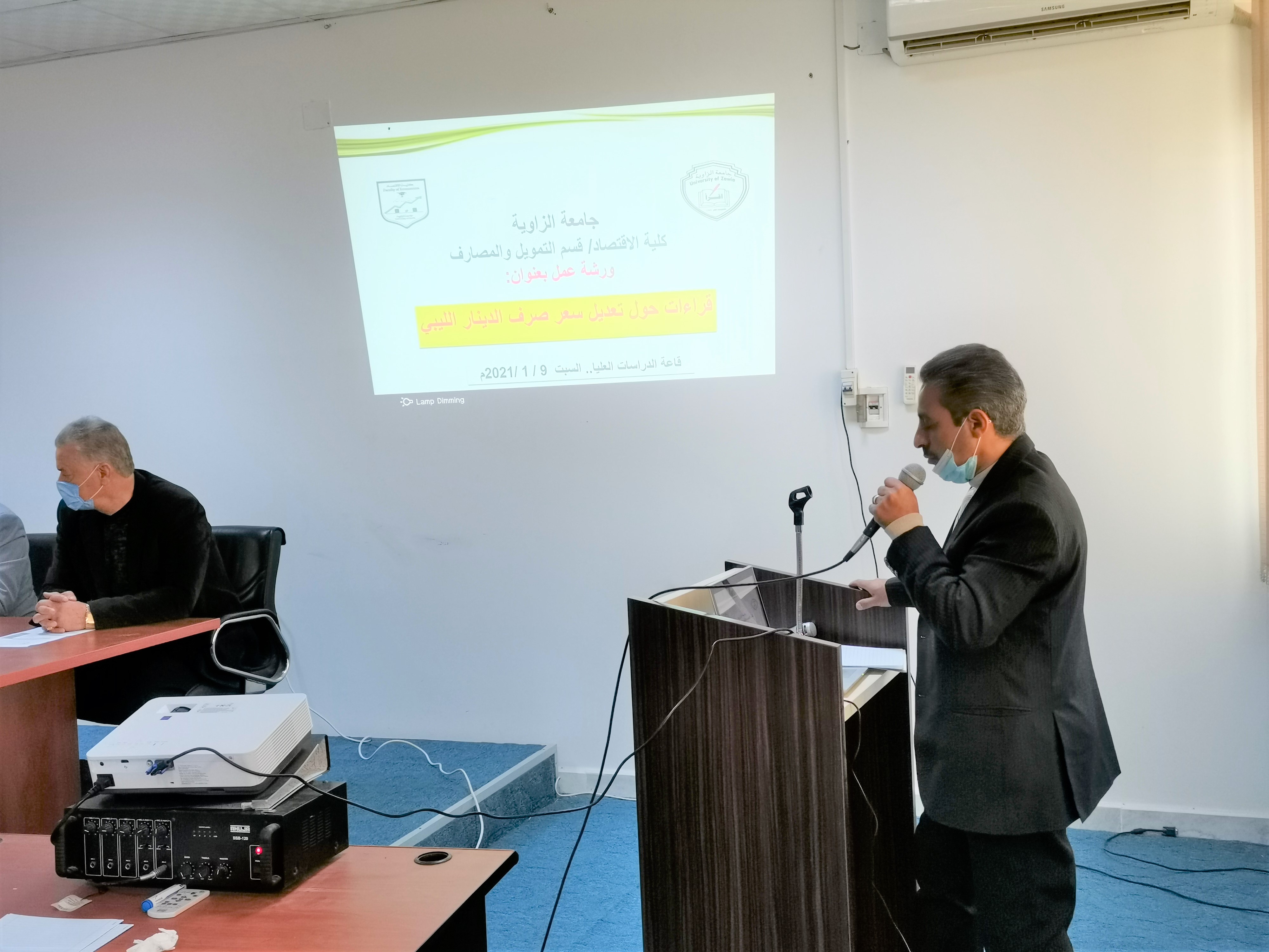 تم يوم أمس السبت الموافق 10/1/2021 على تمام الساعة العاشرة صباحا بمقركلية الاقتصاد بالزاوية عقد ورشة عمل بعنوان: قراءات حول تعديل سعر صرف الدينار الليبي أشرف على تنظيم وتنسيق ورشة العمل السادة أعضاء هيئة التدريس بقسم التمويل والمصارف بالكلية، ولقد تم فيها استضافة السيد عضو لجنة تعديل سعر صرف الدينار الليبي الاستاذ مصباح العكاري الذي قام بتوضيح كافة الجوانب المتعلقة بقرار تعديل سعر صرف الدينار الليبي رقم 1 لسنة 2020، كما تم عرض بعض الورقات البحثية المقدمة من السادة أعضاء هيئة التدريس بالكلية.