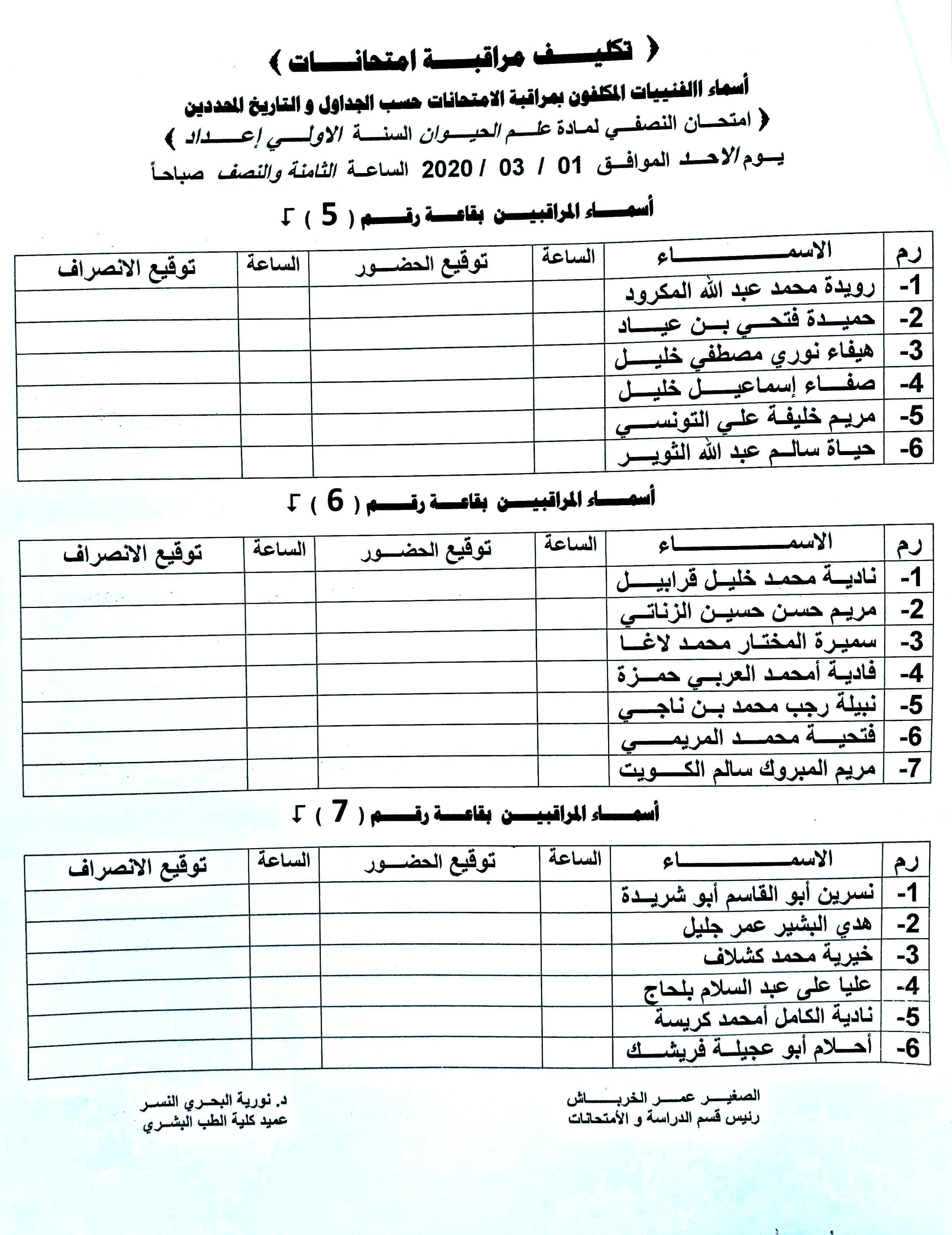 أسماء المكلفين بمراقبة الإمتحان النصفي لمادة علم الحيوان لسنة الإعداد وذلك يوم الأحد الموافق 1-3-2020.