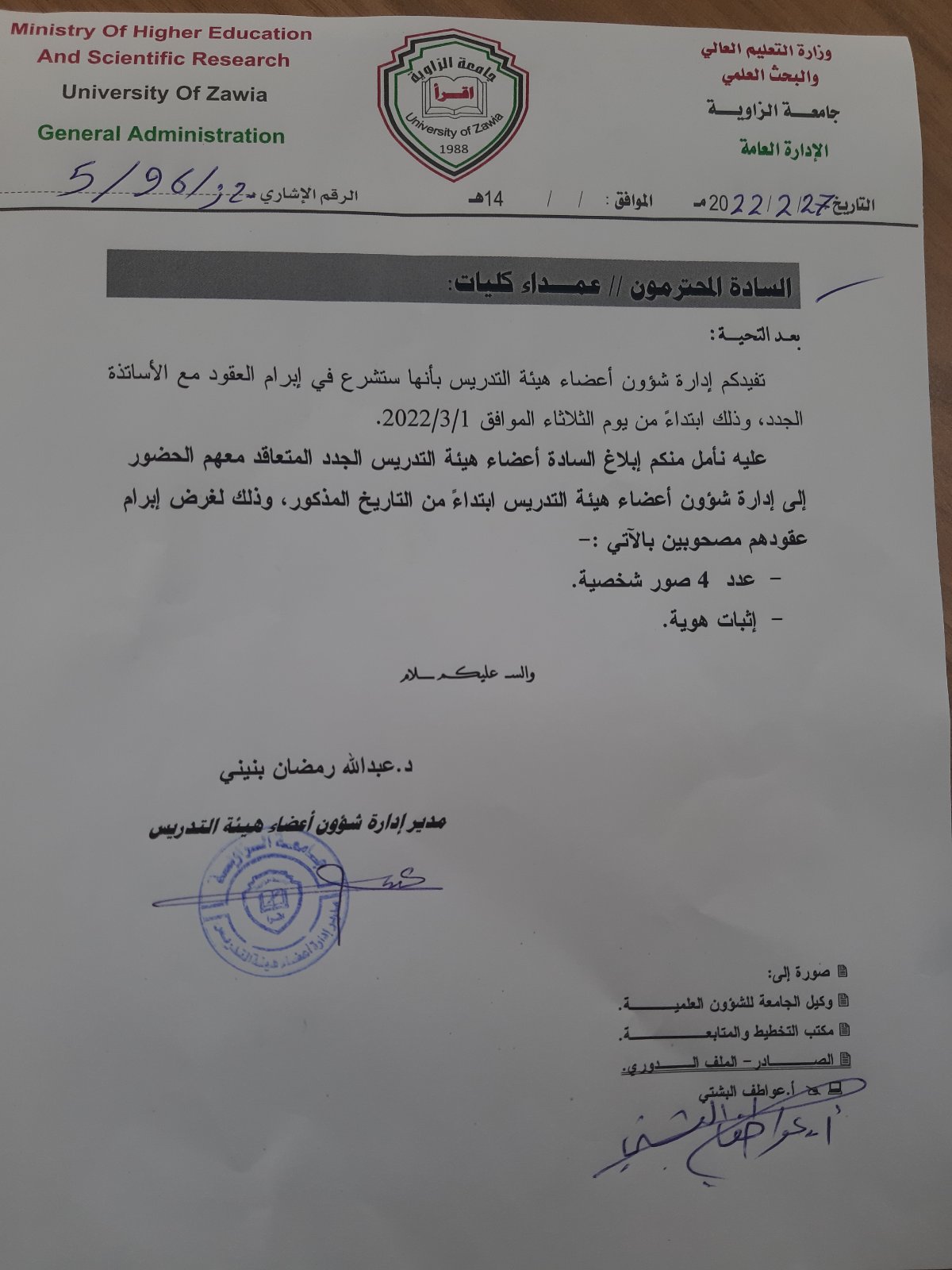 تفيدكم ادارة شؤون اعضاء هيئة التدريس بانها ستشرع في ابرام العقود مع الاساتذة الجدد وذلك ابتداء من يوم الثلاثاء 2022/3/1.